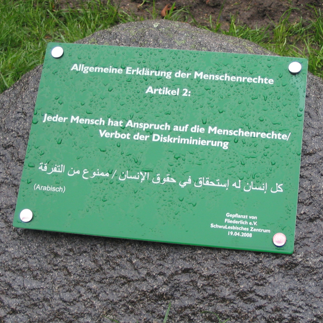 Absichtlich beschädigt wurde auch die Gedenktafel am Menschenrechtsbaum, den Fliederlich 2008 im Nürnberger Stadtpark pflanzte. Anlass Für die Ginkgo-Pflanzung war das 30-jährige Vereinsjubiläum. Die Inschrift auf der Tafel zitiert Artikel 2 der Allgemeinen Erklärung der Menschenrechte, der das Verbot der Diskriminierung benennt.