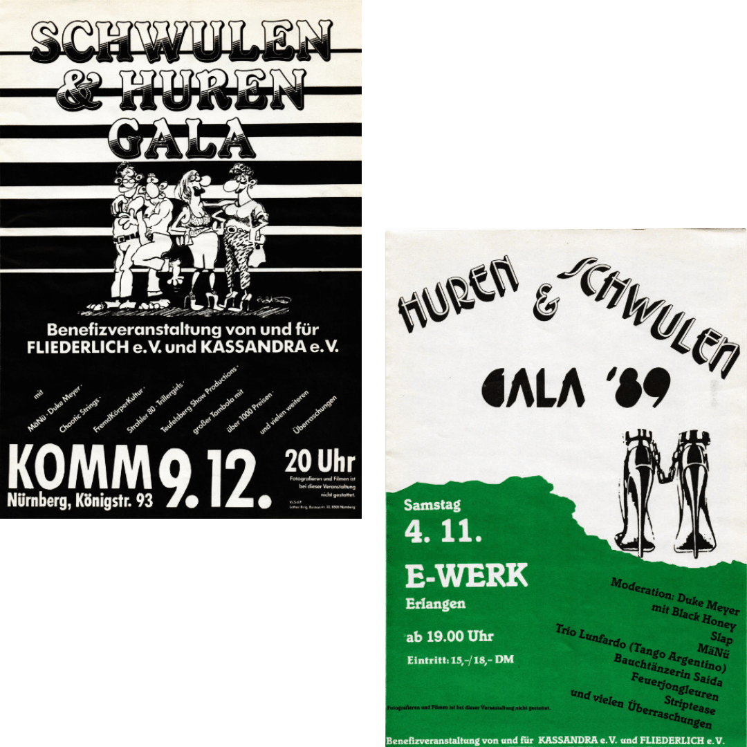 Also luden Fliederlich und Prostituiertenselbsthilfegruppe Kassandra im Dezember 1988 kurzentschlossen zur »1. Schwulen- und Hurengala«. Ort der Veranstaltung war der Festsaal des Jugendzentrums »Komm« (dem heutigen »Künstlerhaus«). Auf dem Programm der ersten Gala standen u. a. die Choatic Strings, Duke Meyer, die Teufelsberg Show Production, der schwule Männerchor MäNü, die schwule Theatergruppe FKK – und ein Stripper-Paar.